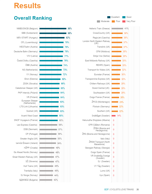 Provision for bikes on (and around) train services in Europe. Three UK rail operators scored ‘good’, while ten were ranked as ‘poor’ by a recent European Cyclists’ Federation report. Source: https://ecf.com/media/ecf%20at%20velo-city/CLT/Cyclists%20Love%20Trains%202025%20Report.pdf