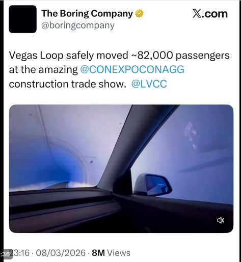 HAVE YOU HEARD OF MASS TRANSIT? In case you didn’t already know: cars in tunnels aren’t the future of transit. This week, Elon Musk’s Boring Company has been boasting on social media about carrying around 82,000 passengers during a five-day expo in Las Vegas. This sounds impressive until you look at the wider context, and compare it with other underground transport systems. By contrast, in London the Elizabeth Line carries ~800,000 people per day. Even Victorian steam trains in 1860s London moved 3–4× more people per hour than Elon.