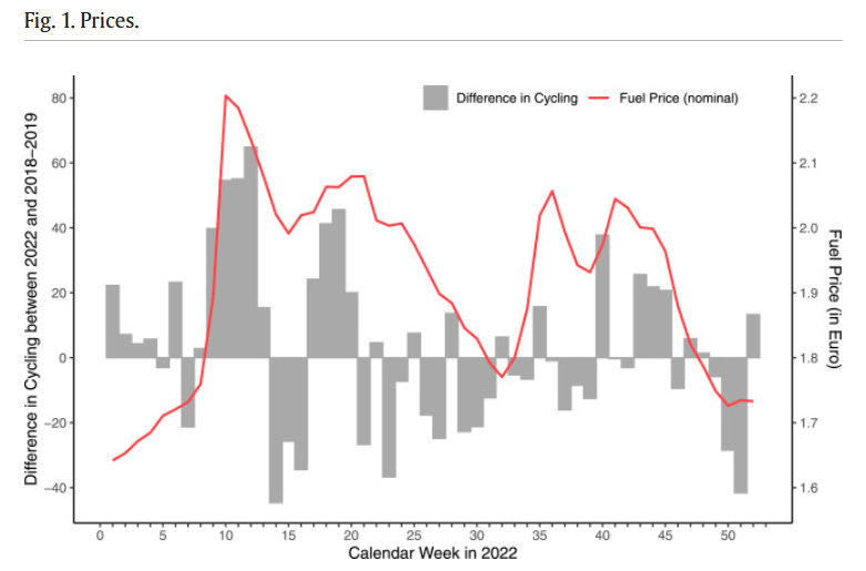 The US and Israel’s war in the Middle East is devastating for people living in the region. It’s also hiking fuel prices globally. This in turn impacts travel choices, as seen on this graph, below. As Bloomberg journalist David Zipper put it, Trump may dislike green transport, but his actions are ‘a giant tailwind’ for cycling. Ultimately, when driving becomes more expensive, we do less of it. Source: https://www.sciencedirect.com/science/article/pii/S0965856424001940