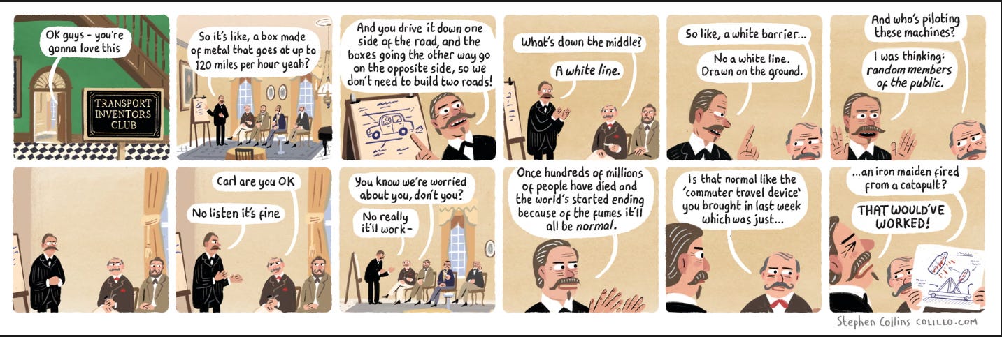 STEPHEN COLLINS NAILS IT. The cartoonist Stephen Collins has produced a couple of doozies in recent months around the dangers we blithely accept when it comes to cars. This one sums it up perfectly (click on the link for full effect):