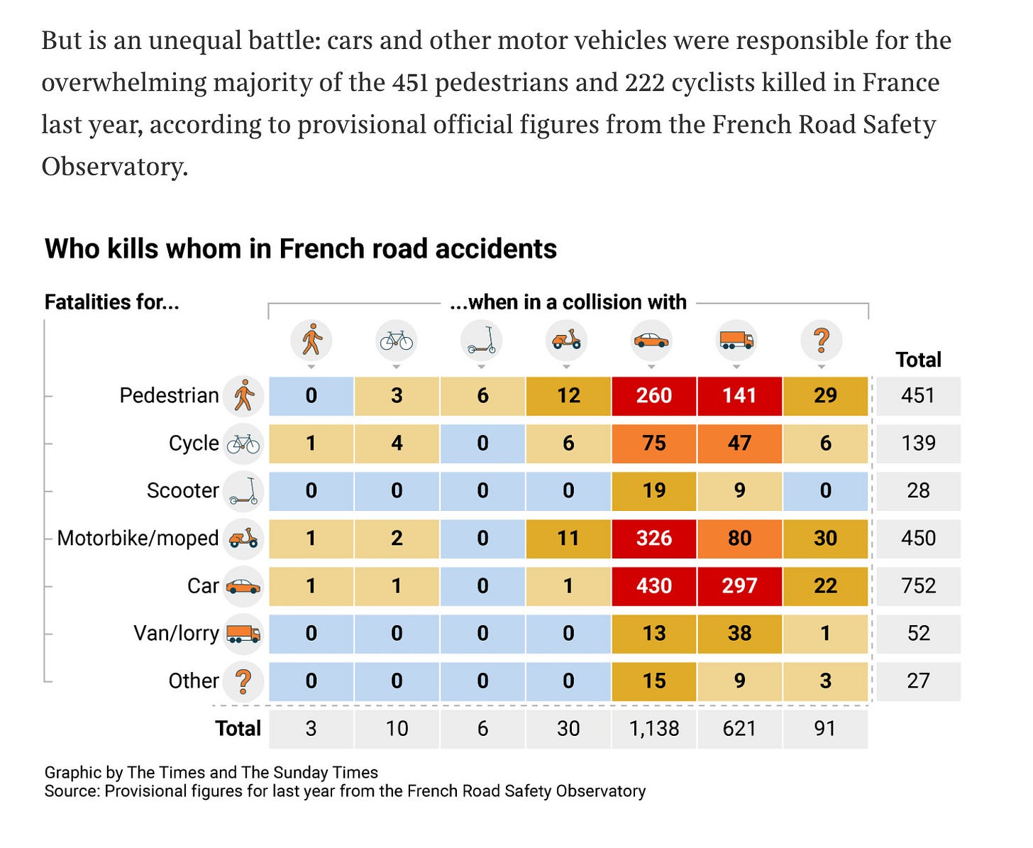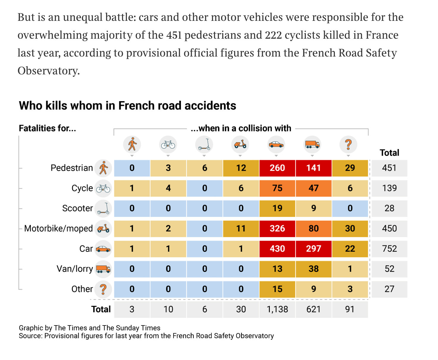 INTERESTING GRAPH OF THE WEEK: This was a graphic tucked into a Times article last month saying Parisians had ‘declared war on reckless cyclists’. Its focus on one of the lesser causes of road danger underlines a stark fact: people being killed or injured by drivers of motor vehicles happens so frequently it ceases to make news. Source: https://www.thetimes.com/world/europe/article/why-parisians-have-declared-war-on-reckless-cyclists-v63ftghn7