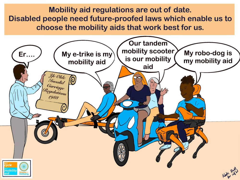 Powered mobility devices: As Wheels for Wellbeing (WfW) puts it, “a mobility aid is any item which a Disabled person uses to help with moving about at or below walking speed”. There are a plethora of such powered devices, ranging from e-cycles and e-scooters, to electric wheelchairs, e-trikes and clip-on handcycle attachments for wheelchair users. At present the law is a bit of a mess, but there’s hope the current consultation will improve matters. WfW would like to see them regulated with LZEVs, lightweight zero emission electric vehicles, with the option to carry more than one person (see week 177).