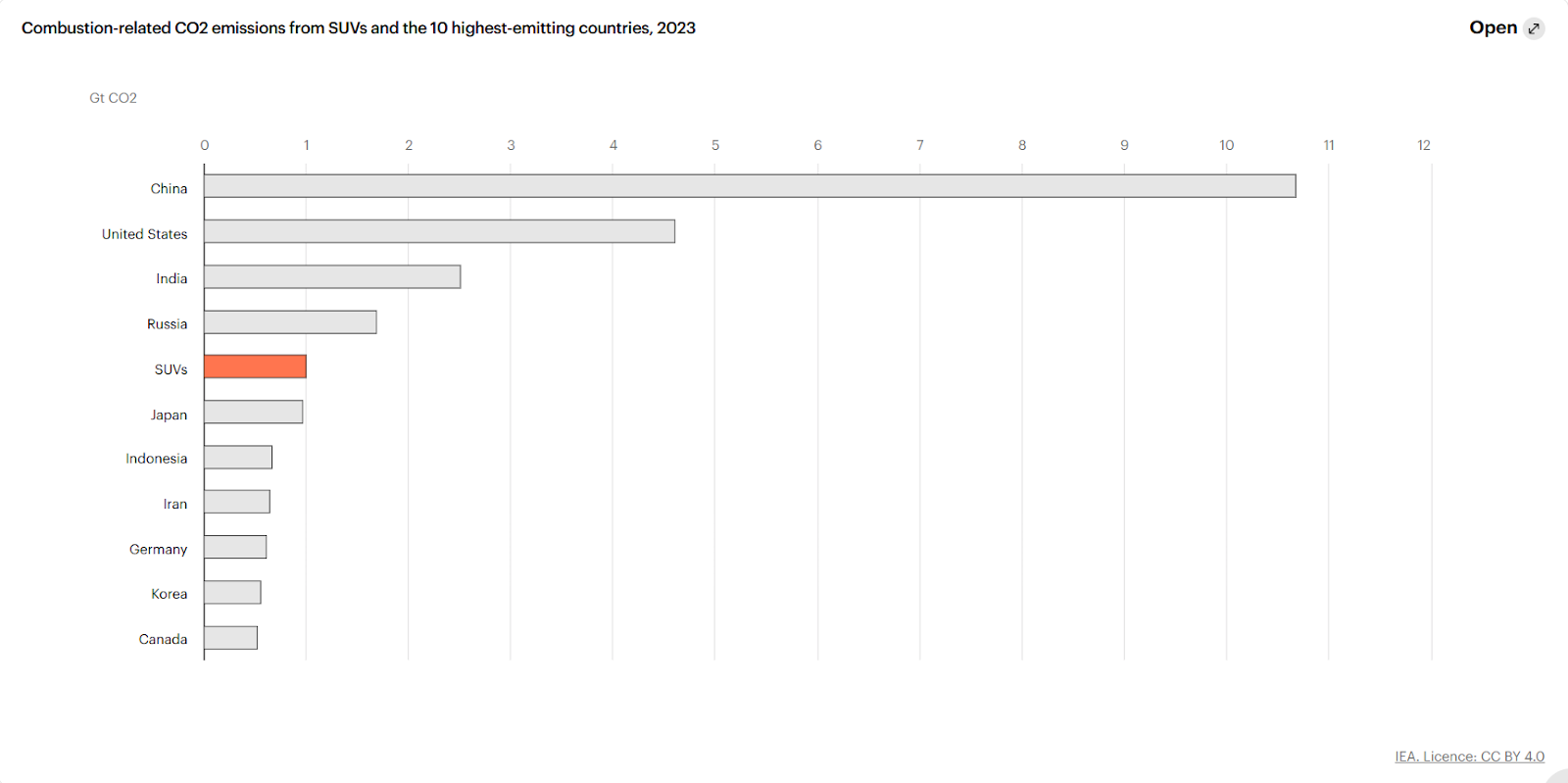 If SUVs were a country they would sit between the nations of Russia and Japan in combustion-related CO2 emissions. Source: https://www.iea.org/commentaries/suvs-are-setting-new-sales-records-each-year-and-so-are-their-emissions