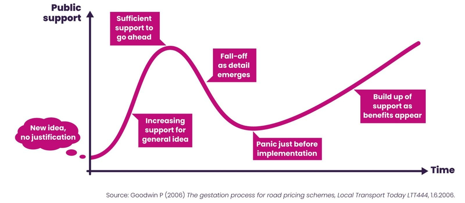 INTERESTING GRAPH OF THE WEEK: Support for traffic reduction measures over time. This graph, adapted from Professor Phil Goodwin’s research, shows how brief snapshots of public opinion can vary hugely, depending on when they are taken. In other words, acceptance and enjoyment of change takes time. Original source: https://www.transportxtra.com/publications/local-transport-today/news/7207/the-gestation-process-for-road-pricing-schemes/
