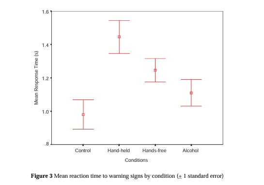 Driving simulations showed worse reaction times during handheld or even hands-free phone conversations than while under the influence of alcohol. Source: https://www.trl.co.uk/uploads/trl/documents/TRL547.pdf